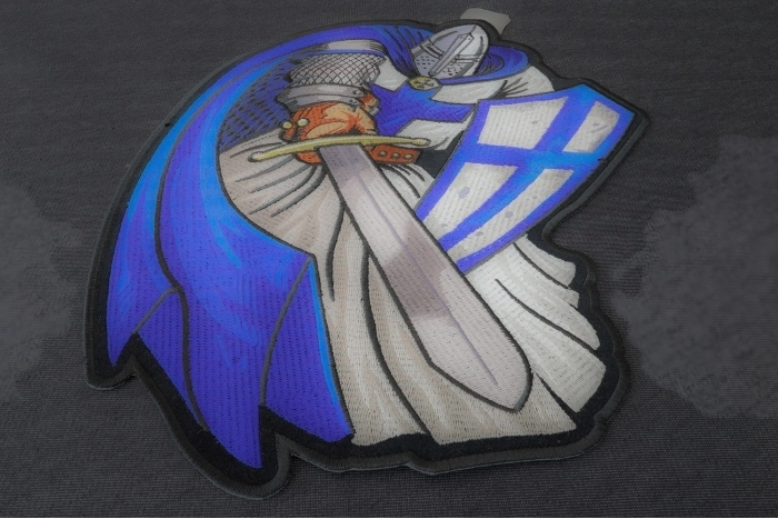 The patch design features a Blue caped Crusader knight holding his sword in one hand and shield on the other. We carry this one in several different colors and sizes. The Blue version of the knight is preferred by our Police friends. The knight patch will take up a decent amount of space sewn on the back of your jacket.