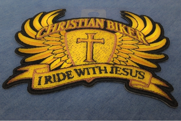 - Christian Biker Iron on Patch Small In Brown I Ride With Jesus