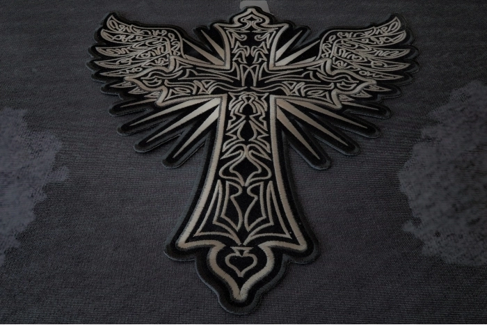 The embroidered patch features a stylized cross with an intricate, tribal-inspired design, incorporating wing-like elements for a dynamic and symbolic appearance. The cross has a flared, Maltese-style shape, with each arm widening toward the ends, and is primarily stitched in shades of beige and gray, giving it a metallic or stone-like texture. The surface of the cross is adorned with swirling, black tribal patterns, adding a sense of movement and complexity, reminiscent of tattoo art or Celtic knotwork, which often symbolizes eternity or interconnectedness. At the ends of the cross's arms, there are wing-like extensions, stitched in gray with white accents to mimic feathers, giving the impression of an angelic or protective presence, symbolizing freedom or spirituality. The bottom of the cross features a small heart shape, also outlined in black, adding a subtle touch of warmth or love to the otherwise bold design. The patch has a black background with a black zigzag stitch border that follows the irregular contours of the cross and wings, set against a dark fabric surface, likely denim, which makes the grayscale design stand out. This patch, with its combination of a cross, tribal patterns, and wings, likely appeals to those with an appreciation for spiritual or gothic aesthetics, intended for decorative use on jackets, vests, or bags to convey a sense of strength, protection, and artistic expression.