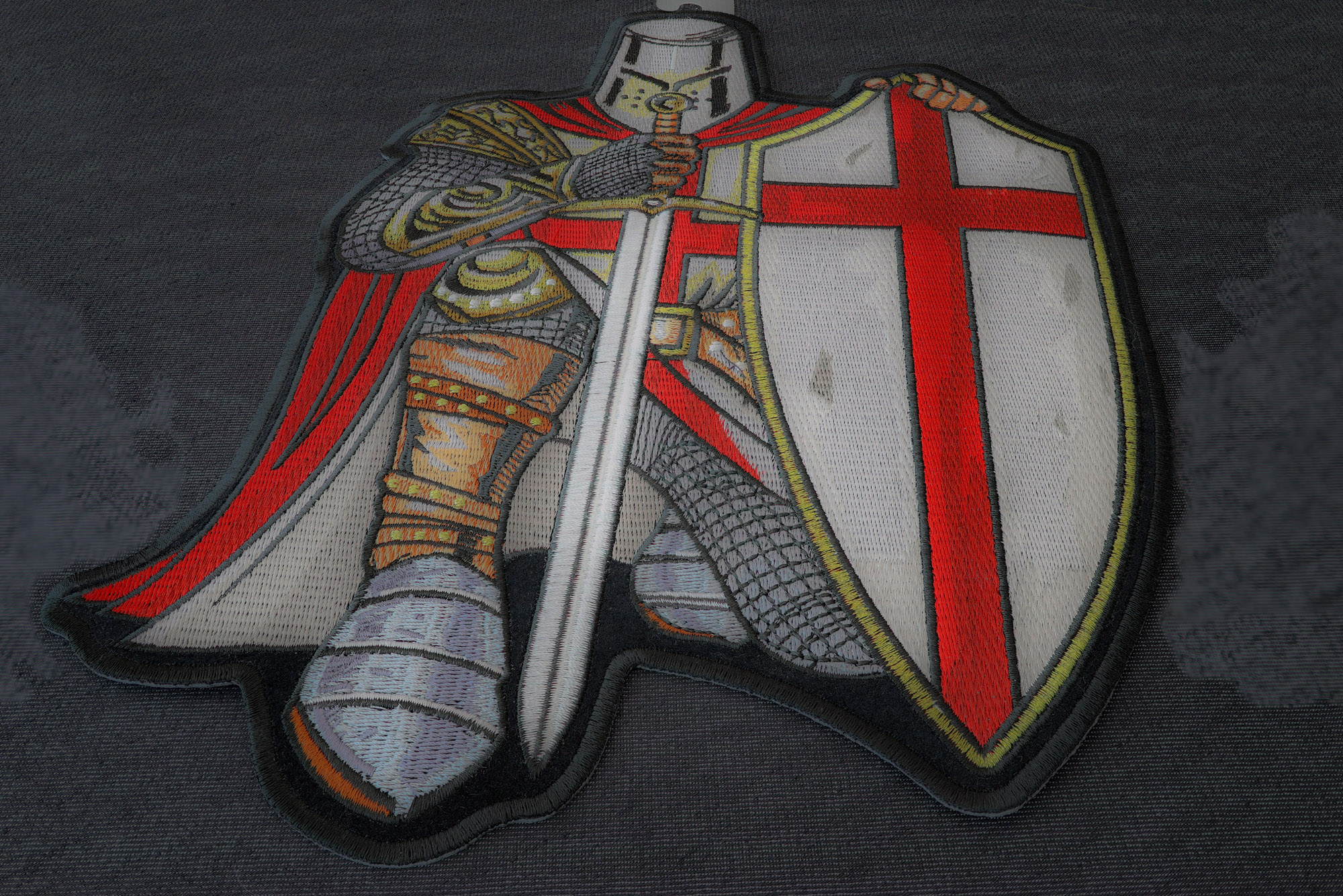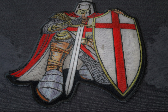 The embroidered patch in the photo depicts a medieval knight in a dynamic, kneeling pose, exuding a sense of strength and honor. The knight is clad in detailed armor, with chainmail and plate armor intricately stitched in shades of gray and silver, accented with gold and brown highlights on the shoulder plates and belt. He wears a helmet with a visor, obscuring his face, and a flowing red cape with a white interior drapes over his shoulders, adding a bold splash of color. In his right hand, the knight grips a long sword, its blade pointed downward and resting on the ground, while his left arm holds a large shield emblazoned with a red cross on a white background, reminiscent of the Crusader or Templar symbol. The patch is outlined with a thin black border, and the background fabric is a dark gray, which contrasts with the vibrant colors and detailed stitching of the knight, making the design stand out prominently.