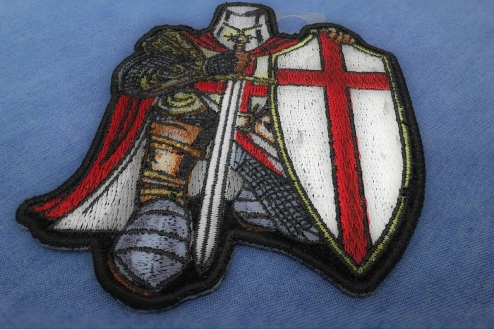 Crusader Knight Patch Small measures 3.3x4.5 inches and is Embroidered in Black / Red / White / Brown / Gray. The Small Patch can be sewn on or ironed on to clothing such as Denim or Leather Jackets, Vests, Hats, Back Packs, Shirts. Features plastic backing and embroidered die cut borders.