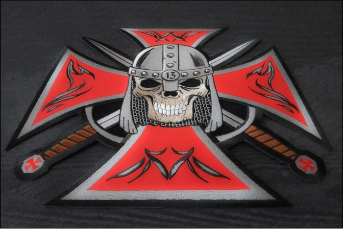 Maltese Cross Skull Knight Patch measures 12x12 inches and is Embroidered in Black / Red / Gray. The patch can be sewn on to Leather Biker Jackets, Vests or Chaps. The patch can also be ironed on to Shirts, Hats or Denim material such as Jeans. Features plastic iron on backing and clean laser cut embroidered borders. Japanese made iron on glue requires temperature between 270-290 Degrees Fahrenheit. Use a heat press for 30 seconds to adhere the patch permanently to your clothing. Using a regular household iron will probably not be as permanent as one hopes. If possible we recommend you sew on your patches for a more durable application. Never iron on patches to Leather or Nylon materials.