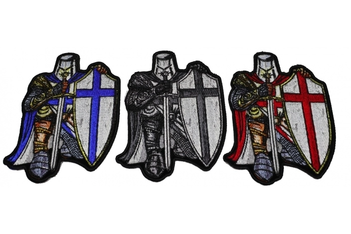 - Set of 3 Kneeling Crusader Knight Patches in Blue Red and Gray