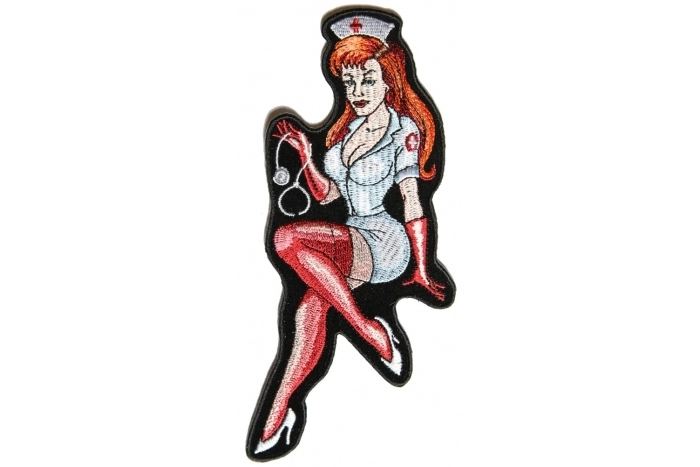 Sexy Red Head Nurse Patch measures 3x6.6 inches and is Embroidered in Black / Red / White. The Small Patch can be sewn on or ironed on to clothing such as Denim or Leather Jackets, Vests, Hats, Back Packs, Shirts. Features plastic backing and embroidered die cut borders.