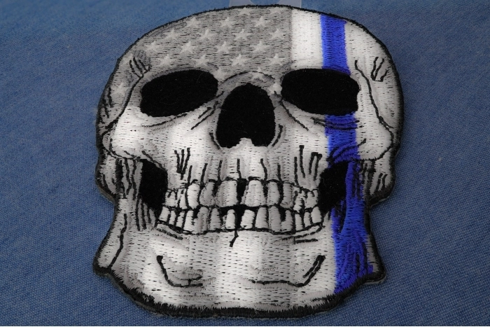 Blue Stripe American Flag Skull Police Patch - 3x4 inch