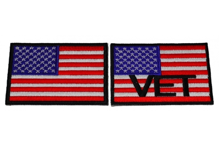 In this American flag Patch set we have two American flags measuring 3x2 inches and featuring black embroidered borders. The flags are both embroidered in Red White and Blue. One of them has VET embroidered in black over it. You asked for it and we made it. You can sew these patches on your black leather vests OR you can heat press them on to denim shirts. You'll notice our patch quality is excellent. We use 100% Rayon Synthetic Thread for the embroidery, and Japanese made iron on glue is applied to the back of each of them. They'll stay on when they are pressed on properly.