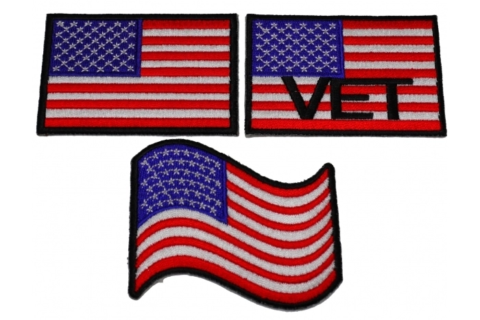 This combination of American flag patches includes 3 of our 3x2 inch American flags with Black borders. You get a rectangular version, a waving flag version and a third one that had VET embroidered in black over it. The borders are embroidered in black and this makes it easier for them to be sewn on to black leather vests. Alternatively the patches do have plastic iron on backing so they can be heat pressed on to denim clothing too. Do not remove the plastic backing from the patches, they also keep the embroidery tightly together making them last longer. The waving flag version measures 2.5 inches in height as opposed to 2 inches.