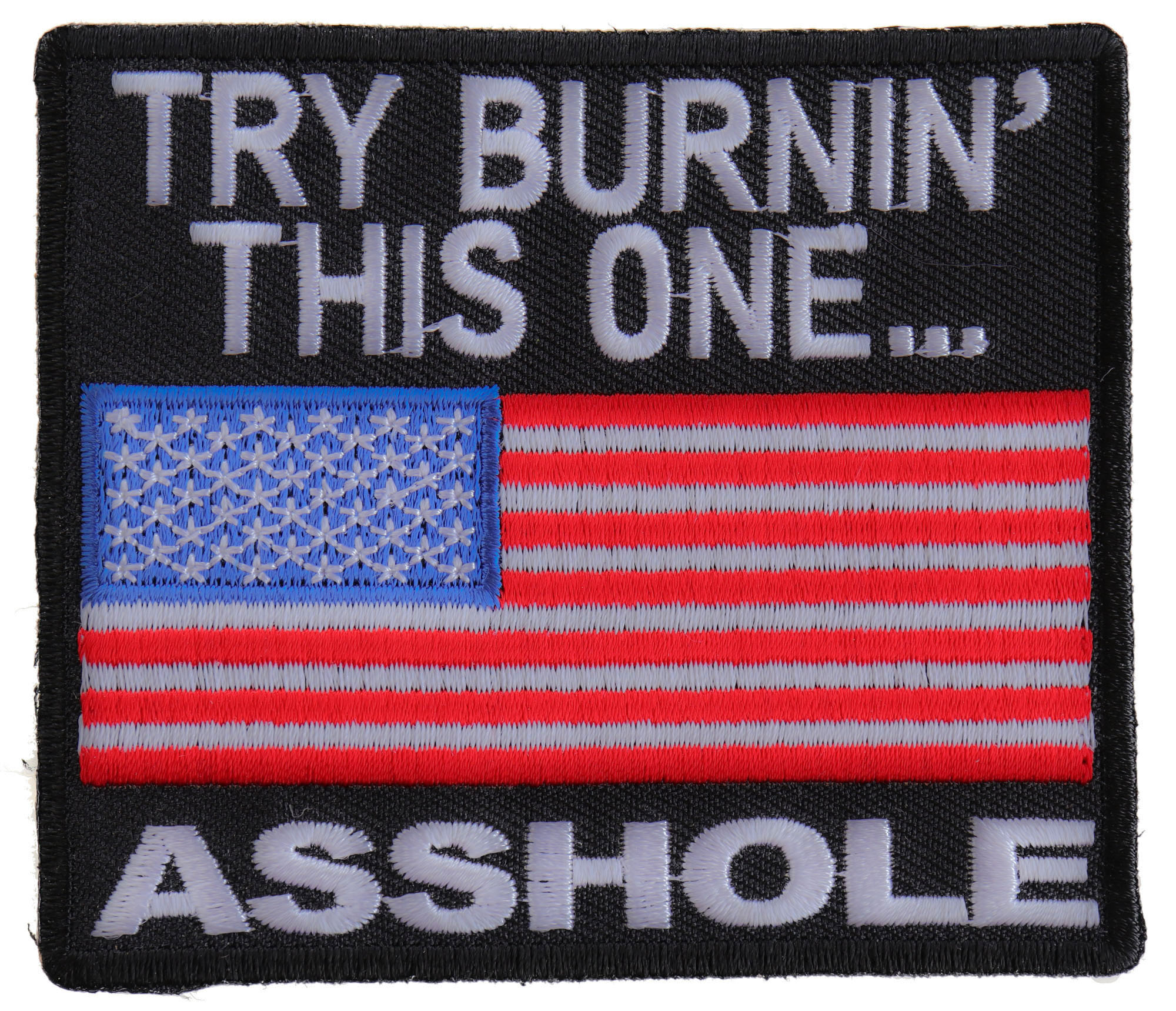 This patch features the American stars and stripes on a black background with the words ‘try burning this one asshole’. It measures 3.5 x 3 inches and can be placed in the center of the back of your jacket or vest so that you are sure it will be seen. Or for greater effect, place it at the front of your clothing so you get to see their faces when they read it.