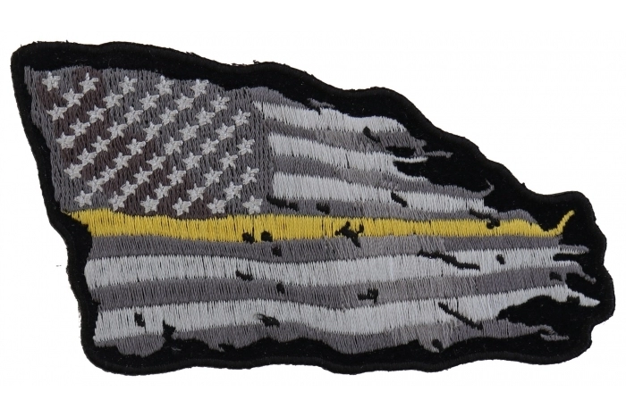 Thin Yellow Line American Tattered Flag Patch measures 4x3 inches and is Embroidered in Black / White / Yellow. The Small Patch can be sewn on or ironed on to clothing such as Denim or Leather Jackets, Vests, Hats, Back Packs, Shirts. Features plastic backing and embroidered die cut borders.