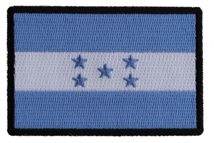 Honduras Flag Patch measures 3x2 inches and is Embroidered in Black / White / Blue. The Small Patch can be sewn on or ironed on to clothing such as Denim or Leather Jackets, Vests, Hats, Back Packs, Shirts. Features plastic backing and embroidered die cut borders.