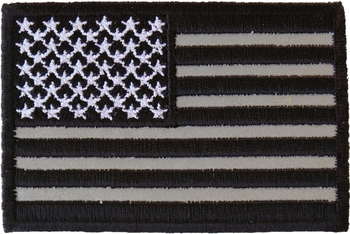 This is a reflective American flag patch that is embroidered in black stripes, white stars and reflective material stripes with black borders. 3x2 inches.