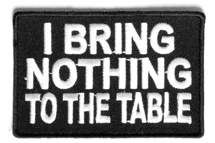 I bring nothing to the table patch measures 3x2 inches. The patch is embroidered in white over black.
