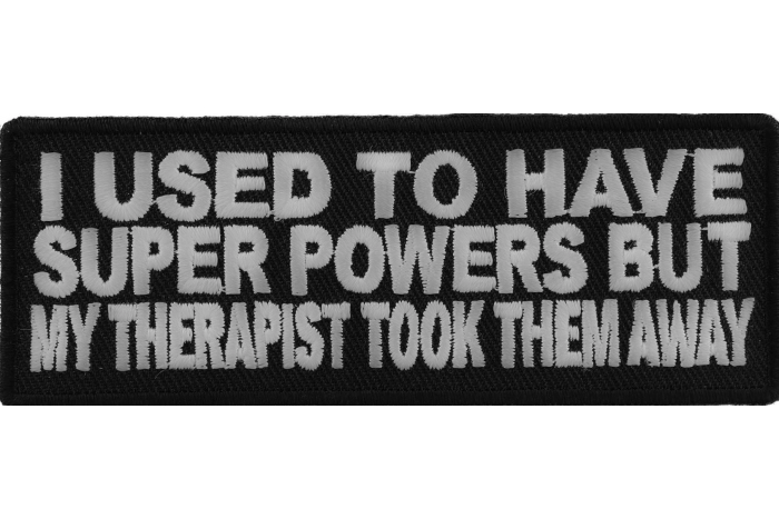 I used to have super powers but my therapist took them away patch is a funny embroidered design. Features plastic iron on backing. Measures 4x1.5 inch. Colors used are Black / White The patch can be ironed on or sewed on to your clothing. Please do not iron on patches to leather or nylon material. A heat press is necessary to properly adhere the patch using the iron on method of application. Using a household iron will not produce professional results and the badge will most likely come off after a few washes. Both heat and pressure are a must to properly iron on a patch. We always recommend you sew on these patches to your clothes for a permanent attachment. The die cut borders featured on these emblems makes it very easy for them to be sewn on.