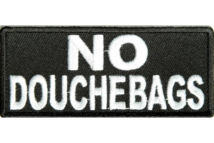 No Douchebags funny patch measures 3.5x1.5 inches. The iron on patch is embroidered in white over black.