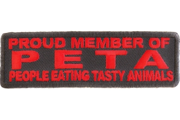 A funny embroidered patch taking the piss out of PETA. It says "Proud Member of PETA" where PETA stands for "People Eating Tasty Animals". No I'm not an animal hater. In fact I love all animals and I don't like the way they raise chicken, cows or pigs in America, but what am I going to do? Got to eat, got to laugh at times. Yes I am for the humane treatment of animals, they taste better when they are raised free to roam and eat different herbs. The patch is embroidered in Red over Black.
