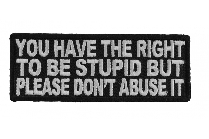 You have the right to be stupid, but please don't abuse it. Explained clearly on this black and white embroidered patch measuring 4x1.5 inches.