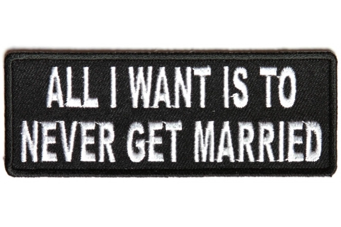 All I Want is to Never Get Married Patch measures 4x1.5 inches and is Embroidered in Black / White. The Small Patch can be sewn on or ironed on to clothing such as Denim or Leather Jackets, Vests, Hats, Back Packs, Shirts. Features plastic backing and embroidered die cut borders.