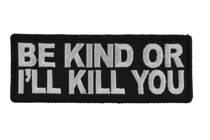 Be kind or I'll Kill you Patch measures 4x1.5 inches and is Embroidered in Black / White. The Small Patch can be sewn on or ironed on to clothing such as Denim or Leather Jackets, Vests, Hats, Back Packs, Shirts. Features plastic backing and embroidered die cut borders.