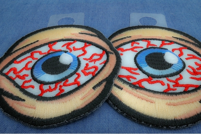 Bloodshot Eyes Patches measures 4.8x2.5 inches and is Embroidered in Black / Brown / Red / White / Blue. The Small can be sewn on or ironed on to clothing. The Bloodshot Eyes Patches features plastic iron on backing and clean laser cut embroidered borders. These Blood Shot Eye Patches are actually two separate patches sold together as one. It's a stoners favorite. Sew them on the back of your jacket, or add them to the eyes of existing large back patches to get a different look. You will be surprised how much of a difference eyes make on patches.