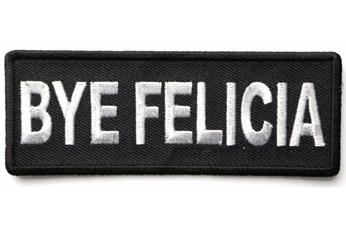Bye Felicia Patch measures 4x1.5 inches and is Embroidered in Black / White. The Small Patch can be sewn on or ironed on to clothing such as Denim or Leather Jackets, Vests, Hats, Back Packs, Shirts. Features plastic backing and embroidered die cut borders.