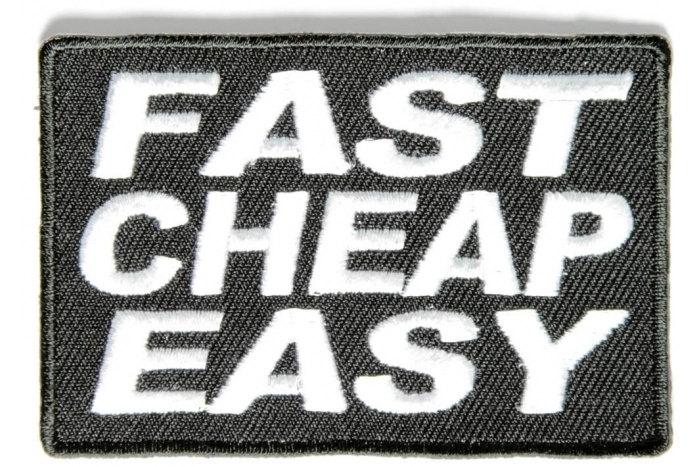Fast Cheap Easy patch is embroidered in Black / White and measures 3x2 inches. You can sew or iron on this patch. If you are applying to leather refrain from ironing on the patch. The embroidered badge does feature die cut borders so you can easily sew it on. You can purchase patches wholesale from us as well.