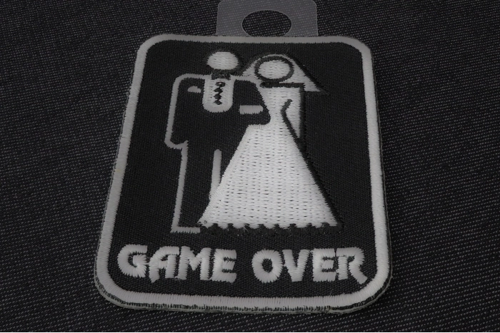Game Over Patch for all married couples. When the rings go on the game stops. You can iron or or sew this funny patch which measures 2x3 inches. Rectangular shaped. Embroidered in white over black. Resized to take up less room on your jacket. More room for other fun patches.