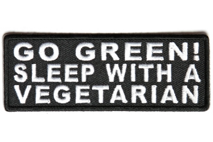 Go Green Sleep with a Vegetarian Patch measures 4x1.5 inches and is Embroidered in Black / White. The Small Patch can be sewn on or ironed on to clothing such as Denim or Leather Jackets, Vests, Hats, Back Packs, Shirts. Features plastic backing and embroidered die cut borders.