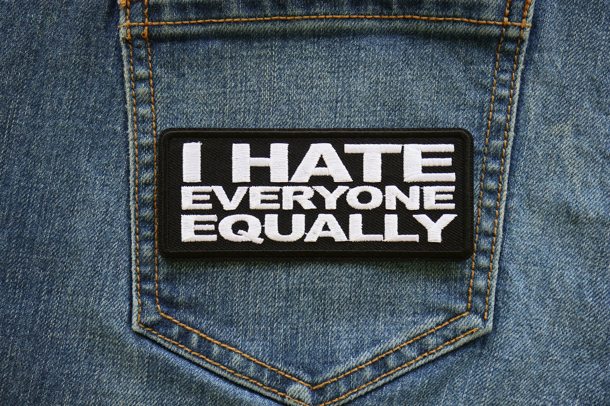 I hate Everyone Equally Iron on Patch measures 4x1.75 inches and is Embroidered in Black / White. The patch can be sewn on to Leather Biker Jackets, Vests or Chaps. The patch can also be ironed on to Shirts, Hats or Denim material such as Jeans. Features plastic iron on backing and clean laser cut embroidered borders. Japanese made iron on glue requires temperature between 270-290 Degrees Fahrenheit. Use a heat press for 30 seconds to adhere the patch permanently to your clothing. Using a regular household iron will probably not be as permanent as one hopes. If possible we recommend you sew on your patches for a more durable application. Never iron on patches to Leather or Nylon materials.