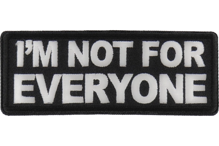 I'm not For Everyone Patch measures 4x1.5 inches and is Embroidered in Black / White. The patch can be sewn on to Leather Biker Jackets, Vests or Chaps. The patch can also be ironed on to Shirts, Hats or Denim material such as Jeans. Features plastic iron on backing and clean laser cut embroidered borders. Japanese made iron on glue requires temperature between 270-290 Degrees Fahrenheit. Use a heat press for 30 seconds to adhere the patch permanently to your clothing. Using a regular household iron will probably not be as permanent as one hopes. If possible we recommend you sew on your patches for a more durable application. Never iron on patches to Leather or Nylon materials.