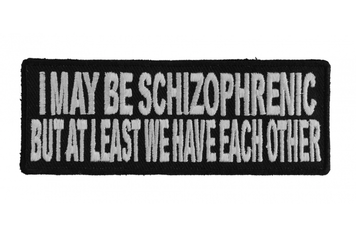 I may be schizophrenic but at least we have each other fun patch measures 4x1.5 inches and is embroidered in Black / White. You can sew this patch on your leather or nylon jacket. It features die cut borders for easy sewing. We also have treated the plastic backing of this patch with heat activated glue. You can also iron on this patch to your clothing. The plastic iron on backing not only gives you the capability to iron on the patch, but it also helps keep the stitches together over time. This is another quality embroidered iron on patch from The Cheap Place. Please refrain from ironing on patches to leather or nylon. Since we cater mainly to Bikers who get them sewn on leather we make sure all our patches feature single color borders for easy sew on application.