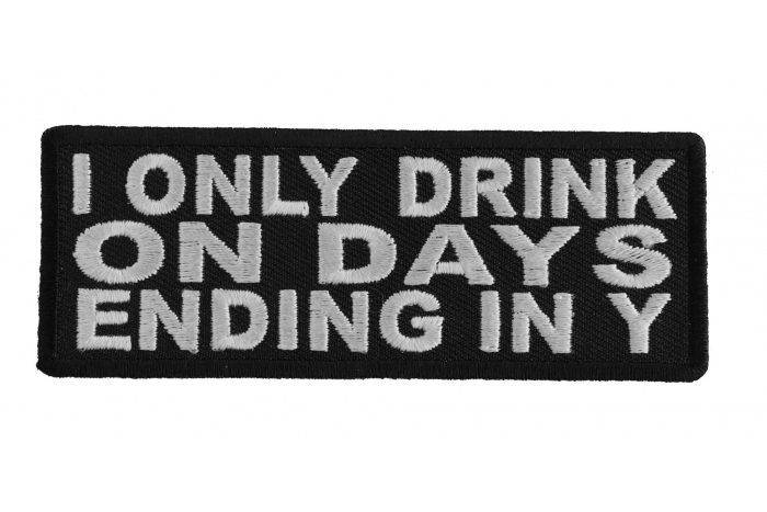 I Only Drink On Days Ending in Y Patch measures 4x1.5 inches and is Embroidered in Black / White. The Small Patch can be sewn on or ironed on to clothing such as Denim or Leather Jackets, Vests, Hats, Back Packs, Shirts. Features plastic backing and embroidered die cut borders.