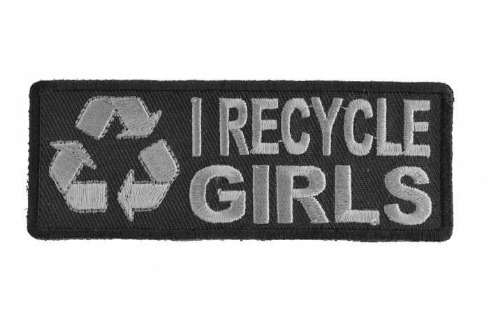 I Recycle Girls Patch measures 4x1.5 inches and is Embroidered in Black / Gray. The Small Patch can be sewn on or ironed on to clothing such as Denim or Leather Jackets, Vests, Hats, Back Packs, Shirts. Features plastic backing and embroidered die cut borders.
