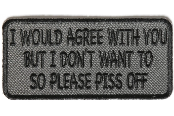 I would Agree with You but I Don't Want to So Please Piss off Patch is embroidered in black over a gray backround. Measures 4x2 inches. The patch can be sewn or ironed on. Do not iron on patches to leather or nylon material.