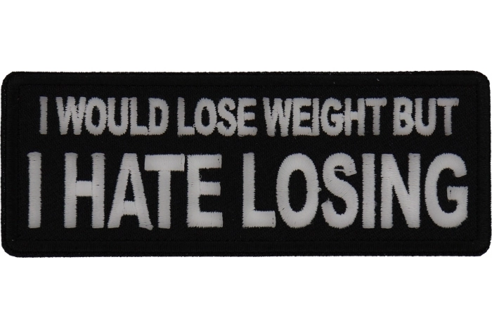 I would lose weight but I hate losing Patch measures 4x1.5 inches and is Embroidered in Black / White. The patch can be sewn on to Leather Biker Jackets, Vests or Chaps. The patch can also be ironed on to Shirts, Hats or Denim material such as Jeans. Features plastic iron on backing and clean laser cut embroidered borders. Japanese made iron on glue requires temperature between 270-290 Degrees Fahrenheit. Use a heat press for 30 seconds to adhere the patch permanently to your clothing. Using a regular household iron will probably not be as permanent as one hopes. If possible we recommend you sew on your patches for a more durable application. Never iron on patches to Leather or Nylon materials.