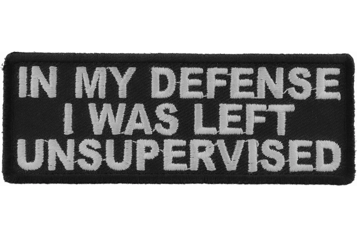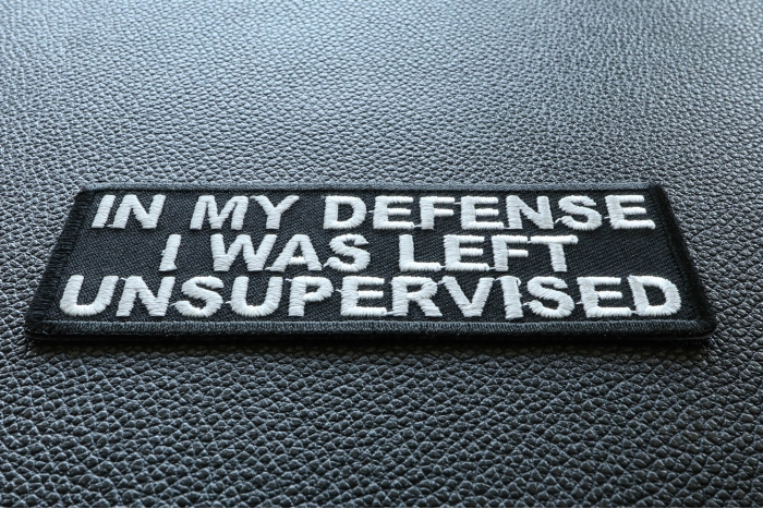 In My Defense I was Left Unsupervised Patch measures 4x1.5 inches and is Embroidered in Black / White. The Small Patch can be sewn on or ironed on to clothing such as Denim or Leather Jackets, Vests, Hats, Back Packs, Shirts. Features plastic backing and embroidered die cut borders. The perfect little excuse to use when things get awkward.