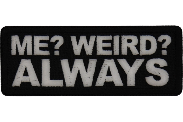 Me Weird Always Patch measures 4x1.5 inches and is Embroidered in Black / White. The patch can be sewn on to Leather Biker Jackets, Vests or Chaps. The patch can also be ironed on to Shirts, Hats or Denim material such as Jeans. Features plastic iron on backing and clean laser cut embroidered borders. Japanese made iron on glue requires temperature between 270-290 Degrees Fahrenheit. Use a heat press for 30 seconds to adhere the patch permanently to your clothing. Using a regular household iron will probably not be as permanent as one hopes. If possible we recommend you sew on your patches for a more durable application. Never iron on patches to Leather or Nylon materials.