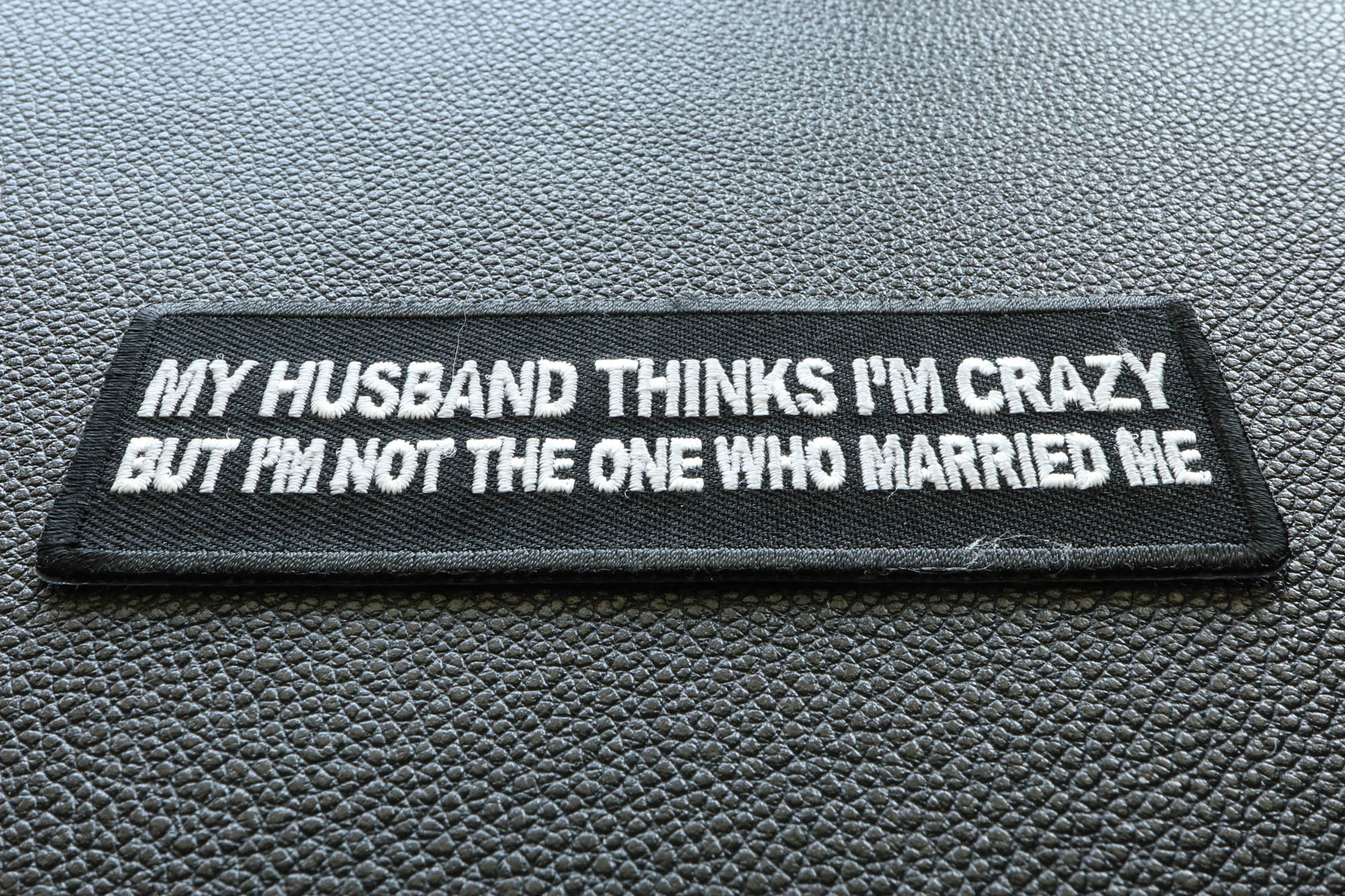My Husband Thinks I'm Crazy, But I'm not the one who Married Me Funny Iron on Patch - 4x1.5 inch