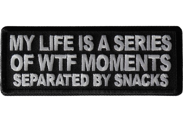 Embrace the chaos of everyday life with the "My Life is a Series of WTF Moments Separated by Snacks" Patch from TheCheapPlace.com. This witty embroidered patch measures 4x1.5 inches and features bold white text on a sleek black twill background, framed by precision laser-cut borders. Crafted with 100% rayon thread synthetic embroidery and backed with Japanese iron-on glue, this patch combines durability with a humorous twist that’s perfect for anyone who finds solace in snacks amidst life’s madness.