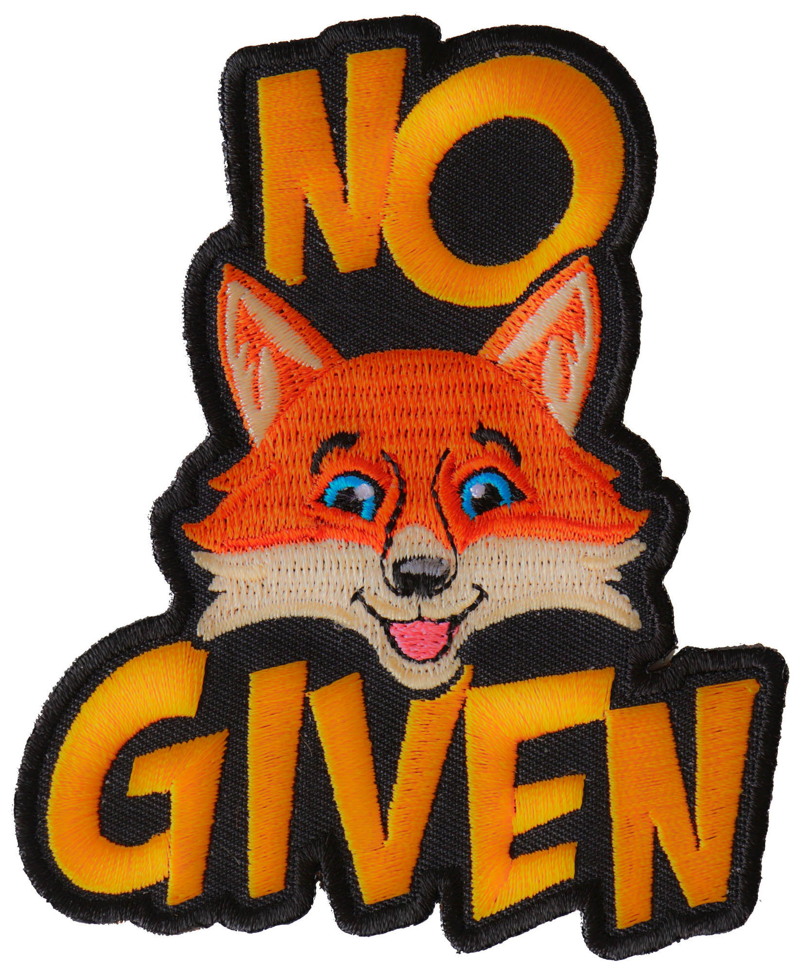 No Fox Given Patch measures 3.3x4 inches. Fox rhymes with Fucks, so we replaced the word fucks with a picture of a Fox. Arturo did a beautiful job picking the right color combination and the font to make this patch as awesome as it looks. The cute little fox is embroidered in orange and beige, he has blue eyes, black nose and a pink tongue, the words above and below the fox are embroidered in orange. We may just make a version of it with the fox alone. He did come out very cute.