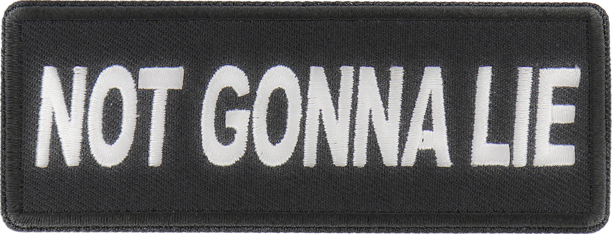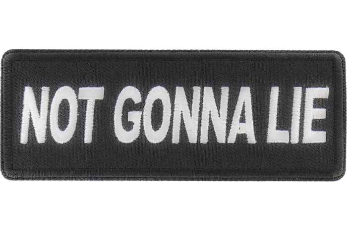 Not Gonna Lie Patch measures 4x1.5 inches and is Embroidered in Black / White. The patch can be sewn on to Leather Biker Jackets, Vests or Chaps. The patch can also be ironed on to Shirts, Hats or Denim material such as Jeans. Features plastic iron on backing and clean laser cut embroidered borders. Japanese made iron on glue requires temperature between 270-290 Degrees Fahrenheit. Use a heat press for 30 seconds to adhere the patch permanently to your clothing. Using a regular household iron will probably not be as permanent as one hopes. If possible we recommend you sew on your patches for a more durable application. Never iron on patches to Leather or Nylon materials.