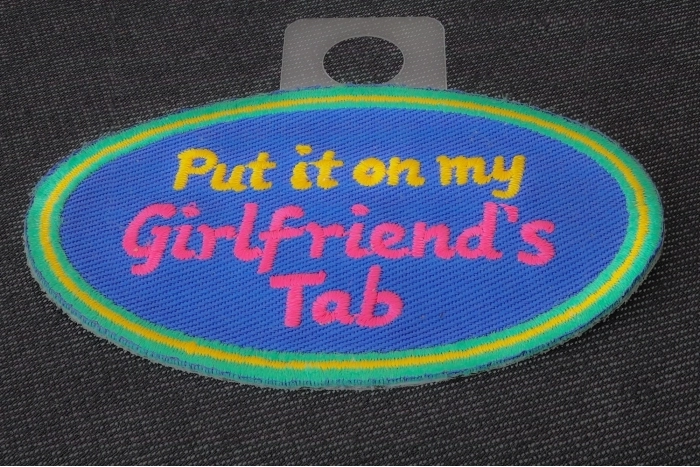 Put it on my Girlfriend's Tab Patch measures 3x2 inches and is Embroidered in Orange / Pink / Green. The patch can be sewn on to Leather Biker Jackets, Vests or Chaps. The patch can also be ironed on to Shirts, Hats or Denim material such as Jeans. Features plastic iron on backing and clean laser cut embroidered borders. Japanese made iron on glue requires temperature between 270-290 Degrees Fahrenheit. Use a heat press for 30 seconds to adhere the patch permanently to your clothing. Using a regular household iron will probably not be as permanent as one hopes. If possible we recommend you sew on your patches for a more durable application. Never iron on patches to Leather or Nylon materials.