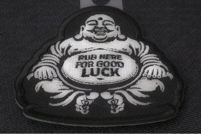 Rub Here for Luck Fat Budha Patch measures 3x3 inches and is Embroidered in Black / White. The patch can be sewn on to Leather Biker Jackets, Vests or Chaps. The patch can also be ironed on to Shirts, Hats or Denim material such as Jeans. Features plastic iron on backing and clean laser cut embroidered borders. Japanese made iron on glue requires temperature between 270-290 Degrees Fahrenheit. Use a heat press for 30 seconds to adhere the patch permanently to your clothing. Using a regular household iron will probably not be as permanent as one hopes. If possible we recommend you sew on your patches for a more durable application. Never iron on patches to Leather or Nylon materials.