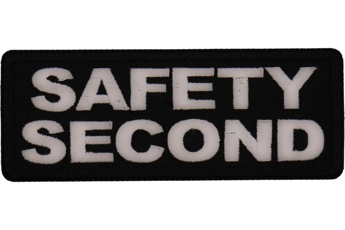 Anybody can do 'safety first', right? Absolutely. That message has been beaten to death. We have an alternative: safety second. You can see it right here on this embroidered biker patch. It is black-and-white. No ambiguity here.