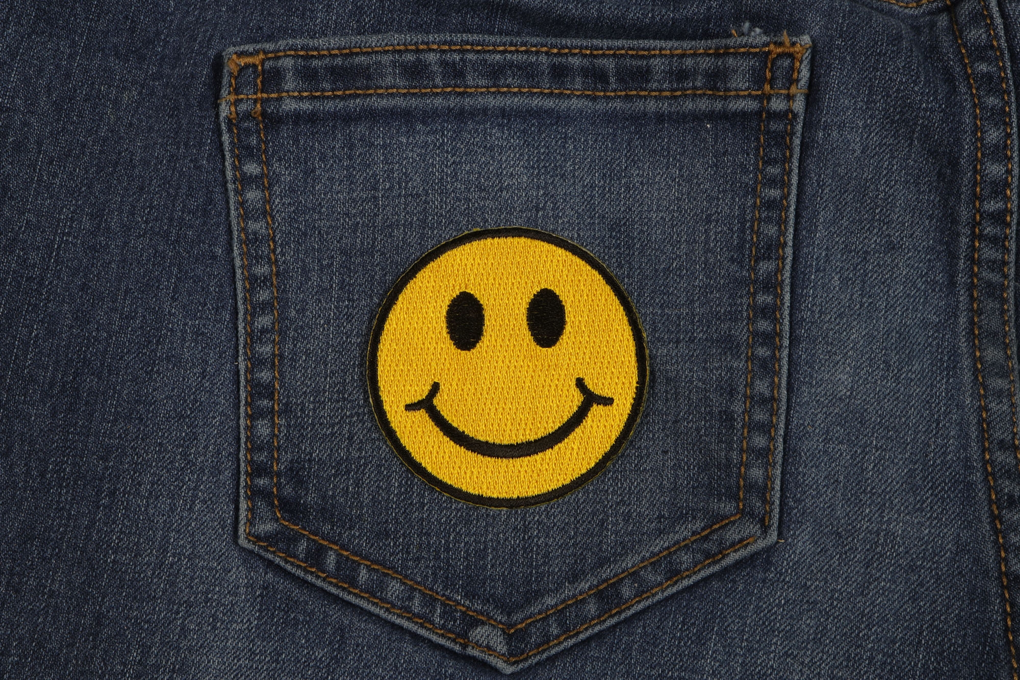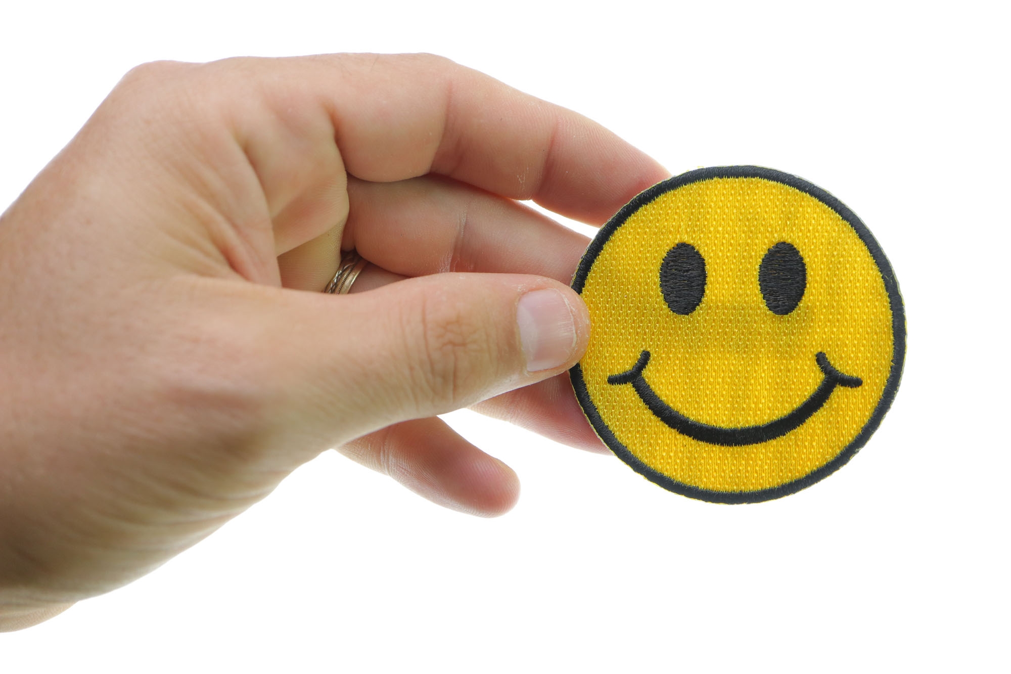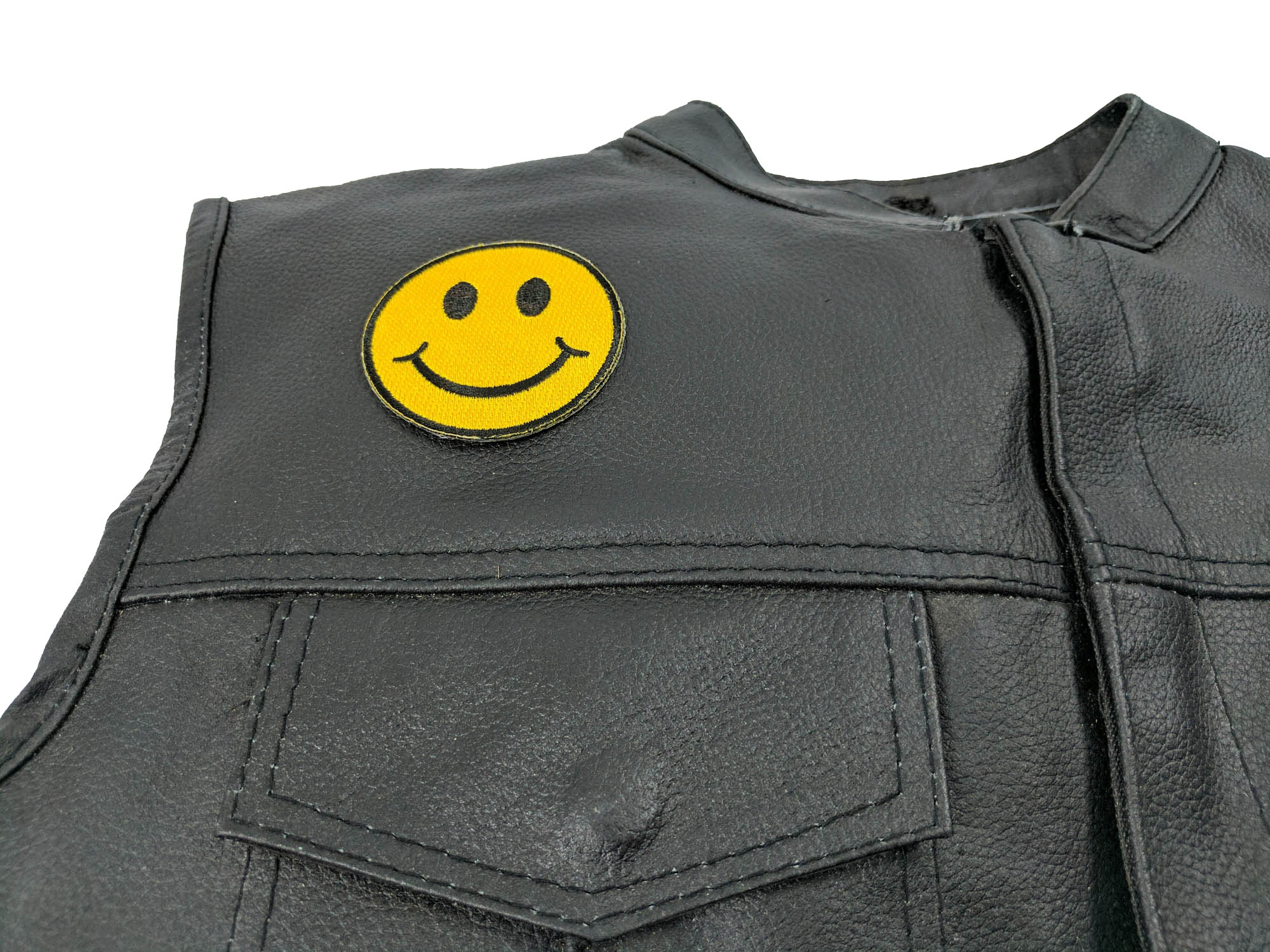 Smiley Patch 2.5 inch Yellow measures 2.5x2.5 inches and is Embroidered in Black / Yellow. The Small Patch can be sewn on or ironed on to clothing such as Denim or Leather Jackets, Vests, Hats, Back Packs, Shirts. Features plastic backing and embroidered die cut borders.