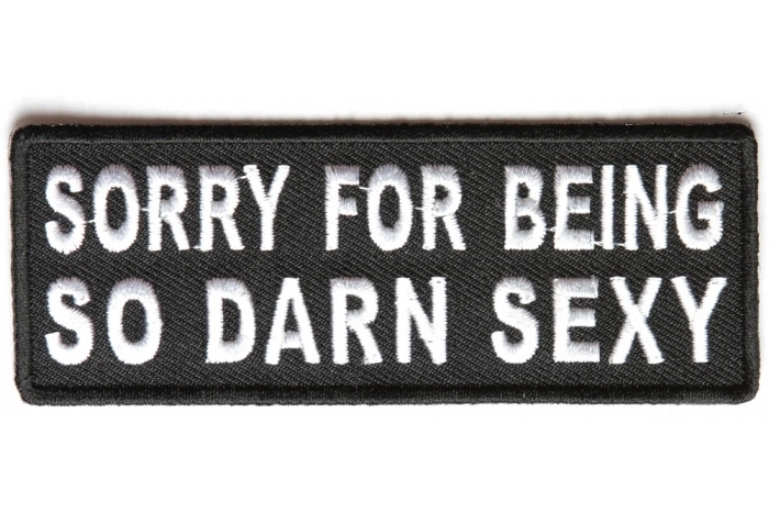 Sorry for Being So Darn Sexy Patch measures 4x1.5 inches and is Embroidered in Black / White. The Small Patch can be sewn on or ironed on to clothing such as Denim or Leather Jackets, Vests, Hats, Back Packs, Shirts. Features plastic backing and embroidered die cut borders.