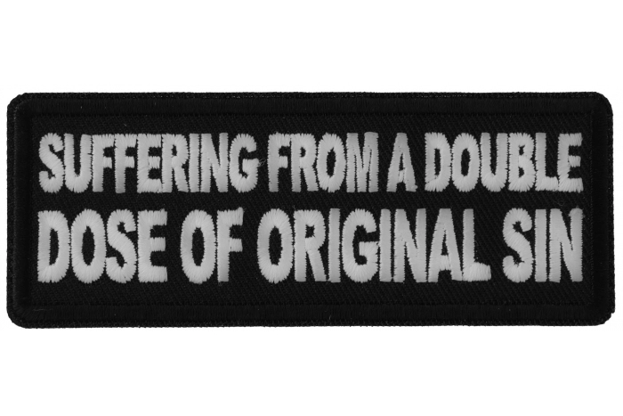 Suffering from a double dose of Original Sin Patch measures 4x1.5 inches and is Embroidered in Black / White. The Small Patch can be sewn on or ironed on to clothing. You should sew patches on to leather jackets or vests. Refrain from ironing on patches to nylon or leather material. The correct iron on temperature is 270 degrees Fahrenheit. If you are using a household iron you should press down for 30 seconds. If you are using a heat press 12 seconds is sufficient. The patch features clean cut embroidered borders which will make it easy to sew on. We cannot recommend an iron setting which will yield you 270 degrees temperature. You can use a frying pan thermometer to find the correct setting of your iron. The temperature setting is very important. Plus or minus 10 degrees of variation is acceptable. But you should never go over 280 degrees Fahrenheit when ironing on the patch. Anything under 260 will also not activate the glue properly. The recommended 270 degrees Fahrenheit setting applies to all our iron on patches. We cannot speak for other manufacturers though. We spend the extra dime to use Japanese brand glue which works very well if applied at the right temperature.