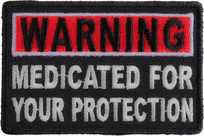 Warning Medicated For Your Protection Funny Iron on Patch - 3x1.5 inch
