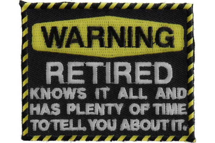 Warning Retired Knows It All And Has Plenty Of Time To Tell You About It. A funny embroidered patch for all retired people. Measures 3.5x3 inches in size, you can have it ironed on to a shirt or sew it on to your leather. Features yellow and black warning striped borders for a cool finish.