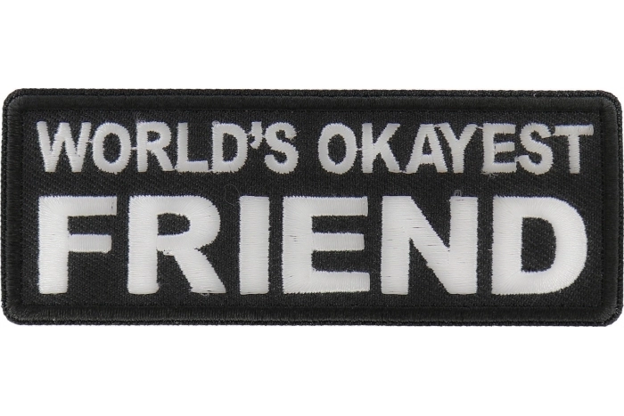 World's Okayest Friend Patch measures 4x1.5 inches and is Embroidered in Black / White. The patch can be sewn on to Leather Biker Jackets, Vests or Chaps. The patch can also be ironed on to Shirts, Hats or Denim material such as Jeans. Features plastic iron on backing and clean laser cut embroidered borders. Japanese made iron on glue requires temperature between 270-290 Degrees Fahrenheit. Use a heat press for 30 seconds to adhere the patch permanently to your clothing. Using a regular household iron will probably not be as permanent as one hopes. If possible we recommend you sew on your patches for a more durable application. Never iron on patches to Leather or Nylon materials.