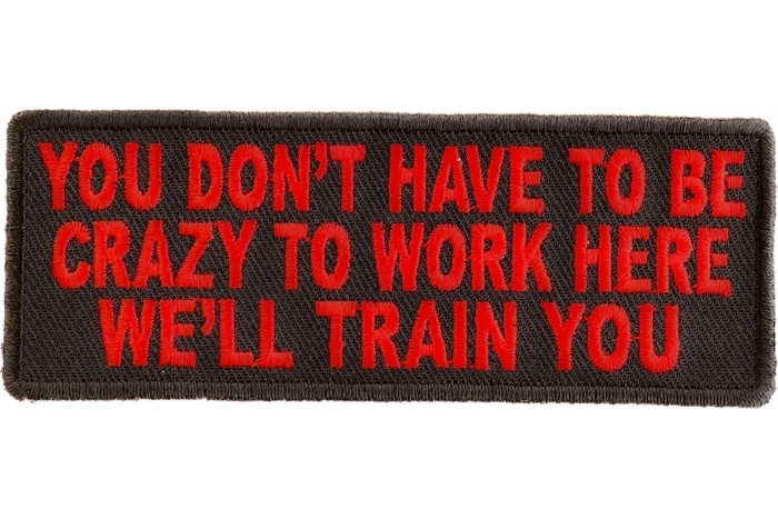 You Don't Have To Be Crazy To Work Here We'll Train You Funny Iron on Patch - 4x1.5 inch